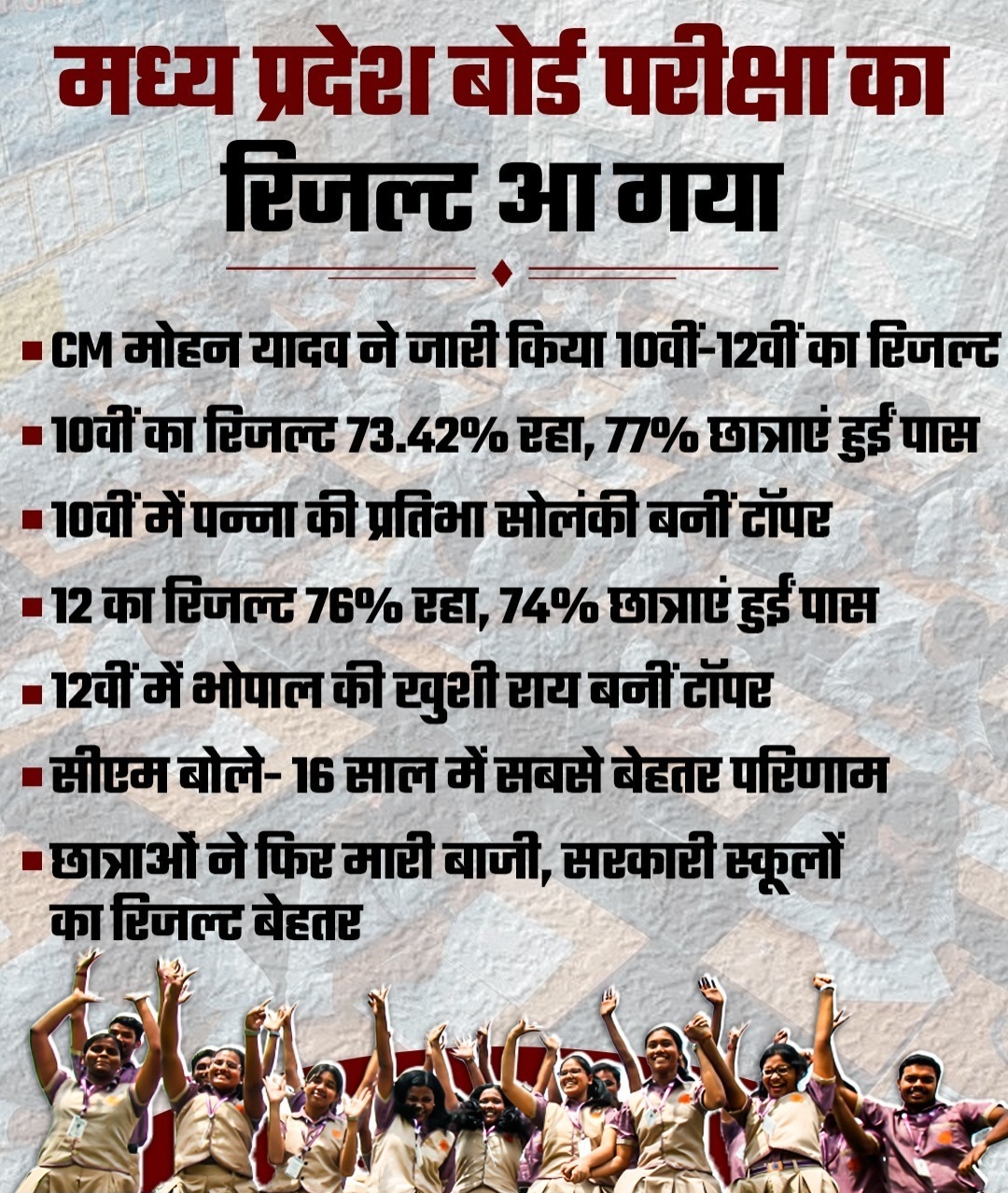 एमपी बोर्ड 12वीं में इस बार कुमारी खुशी राज ने टॉप किया. कुल उत्तीर्ण प्रतिशत 76.01% दर्ज किया गया, जबकि कुल छात्रों का पास प्रतिशत 72.39% रहा. इस बार छात्राओं ने बेहतर प्रदर्शन किया है, उनका पास प्रतिशत 79.41% रहा, जो छात्रों से अधिक है. वहीं शासकीय (सरकारी) विद्यालयों का परिणाम 80.43% रहा, जबकि अशासकीय (प्राइवेट) विद्यालयों का उत्तीर्ण प्रतिशत 69.67% दर्ज किया गया।